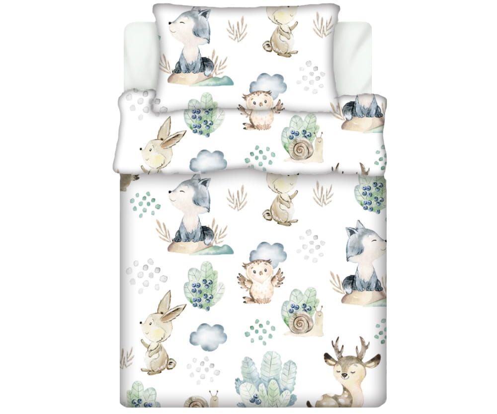 Pościel 100% BAWEŁNA Renforce DLA DZIECI | 135x100cm (poszwa) + 1x 40x60cm (poszewka) | Do łóżeczka, przedszkola, żłobka | Wykończenie satynowe | JEŻ I SARNA