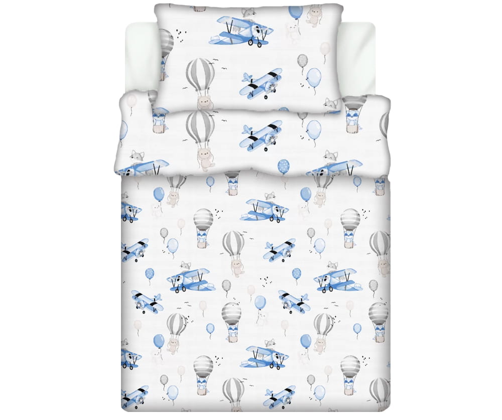 Pościel 100% BAWEŁNA Renforce DLA DZIECI | 135x100cm (poszwa) + 1x 40x60cm (poszewka) | Do łóżeczka, przedszkola, żłobka | Wykończenie satynowe | LIS W SAMOLOCIE NIEBIESKI