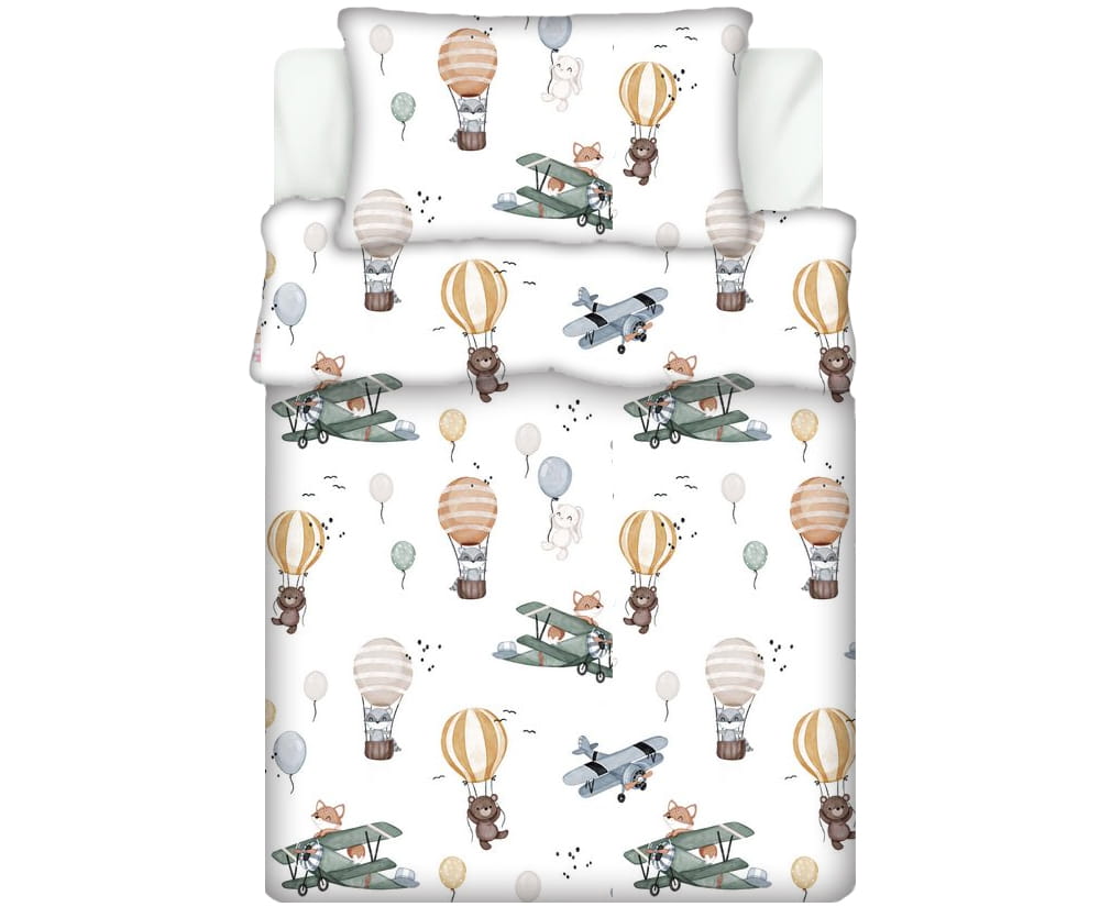 Pościel 100% BAWEŁNA Renforce DLA DZIECI | 135x100cm (poszwa) + 1x 40x60cm (poszewka) | Do łóżeczka, przedszkola, żłobka | Wykończenie satynowe | LIS W SAMOLOCIE ZIELONY