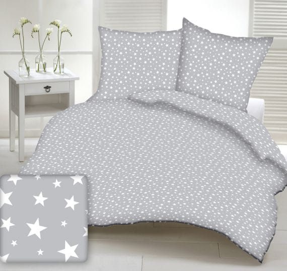 Pościel 100% BAWEŁNA Renforce | 140x200cm (poszwa) + 1x 70x80cm (poszewka) | Wykończenie satynowe | GWIAZDKI NA SZARYM