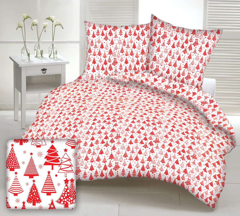 Pościel 100% BAWEŁNA Renforce | 160x200cm (poszwa) + 2x 70x80cm (poszewki) | Wykończenie satynowe | CZERWONY LAS CHOINEK