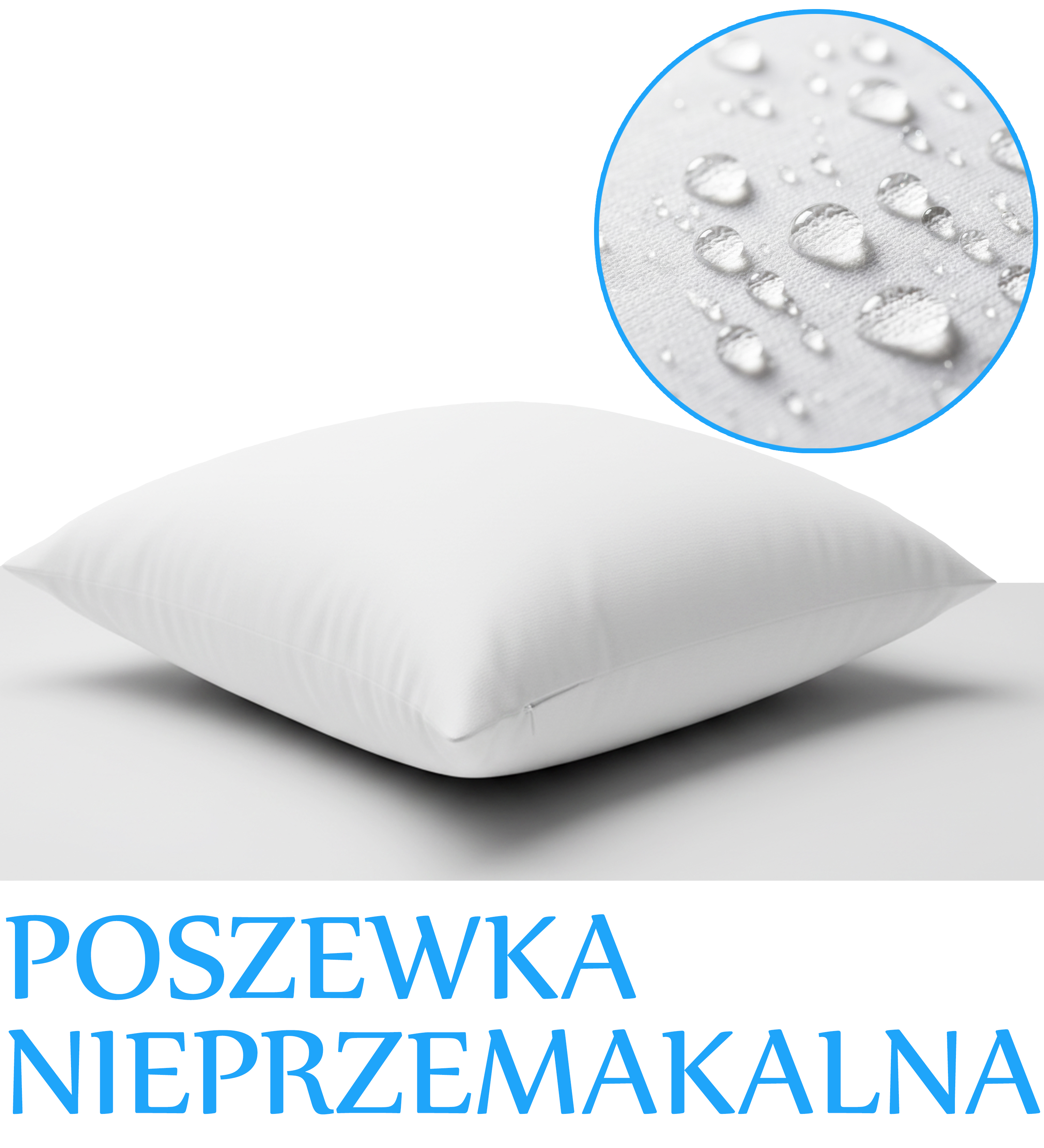 - Wewnętrzna warstwa (ochronna): To innowacyjna, wodoodporna i nieprzemakalna membrana 100% PU (poliuretan), która niezawodnie blokuje przenikanie płynów do wnętrza poduszki.